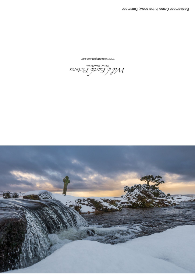 Beckamoor Cross in the snow - Dartmoor, Devon. A6 photographic greeting card. Blank inside for your own message