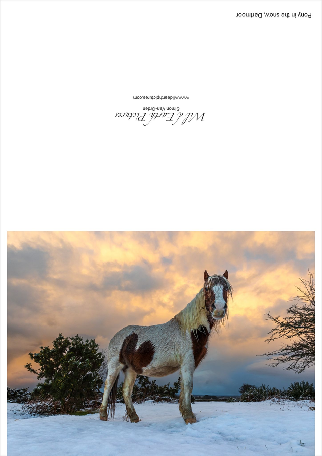 Pony in the snow, Dartmoor, Devon. A6 photographic greeting card. Blank inside for your own message.