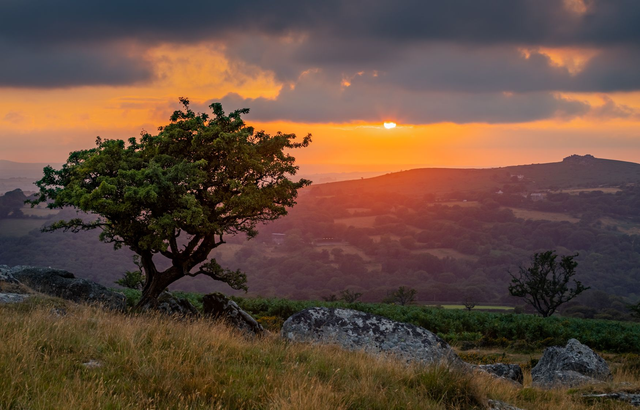 The image, taken by myself, is of the sun setting at Ingra Tor, Dartmoor, Devon. In the distance is Pew Tor.